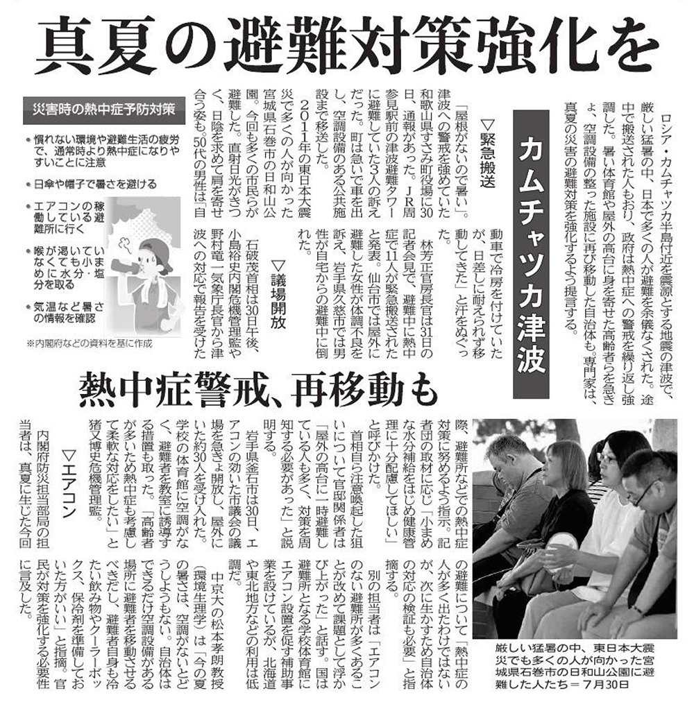 真夏の避難対策強化を カムチャツカ地震(茨城新聞 2025年8月1日付朝刊)