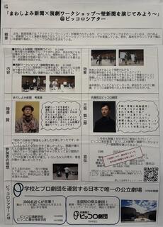 約10年前から、まわしよみ新聞作りと演劇を掛け合わせたワークショップ「壁新聞を演じてみよう」を行っているのは、兵庫県尼崎市の県立劇場ピッコロシアター。今年8月のワークには20~70代の23人が参加し、自分たちで作った壁新聞にヒントを得て脚色した劇を創作、ユーモアたっぷりに演じた。興味深かったので、まわしよみ新聞作りの講師を務めた私も劇に参加した。