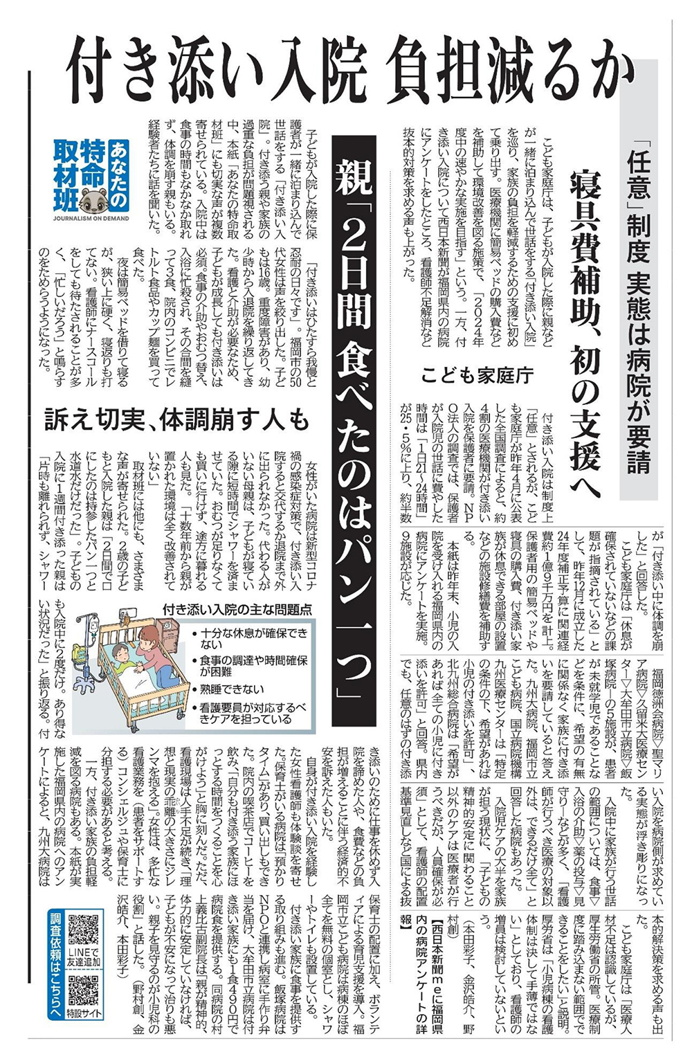 ①付き添い入院 負担減るか(西日本新聞 2025年1月13日付朝刊)