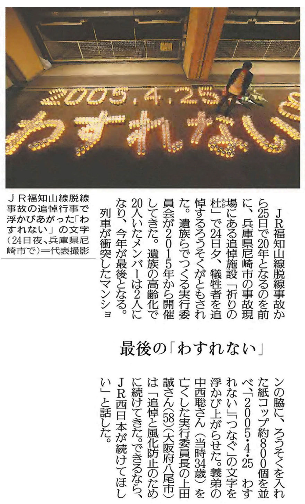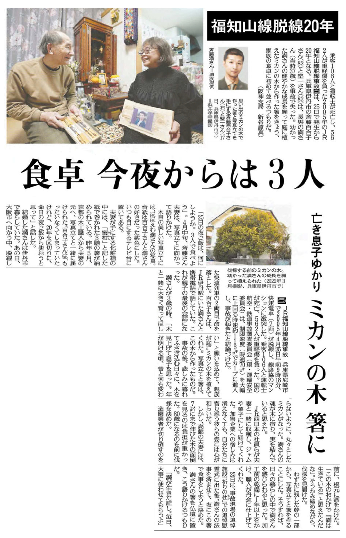 福知山線脱線20年 食卓 今夜からは3人(読売新聞 2025年4月25日付朝刊)