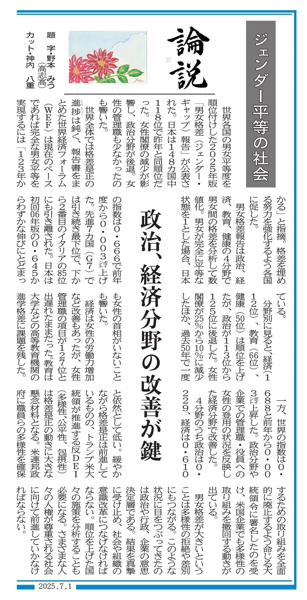 ジェンダー平等の社会 政治、経済分野の改善が鍵(福井新聞 2025年7月1日付朝刊)