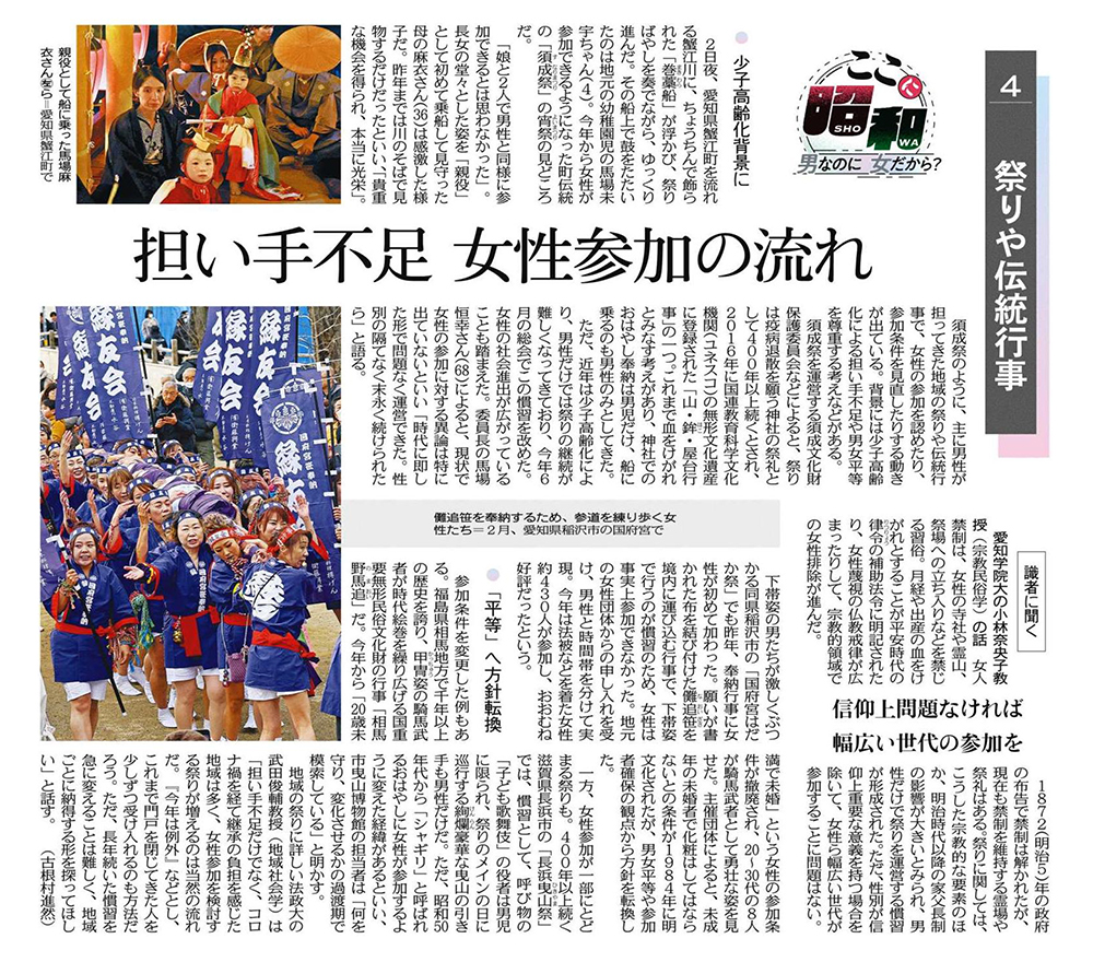 ここに昭和 男なのに 女だから?(4)祭りや伝統行事 担い手不足 女性参加の流れ(中日新聞 2025年8月21日付朝刊)