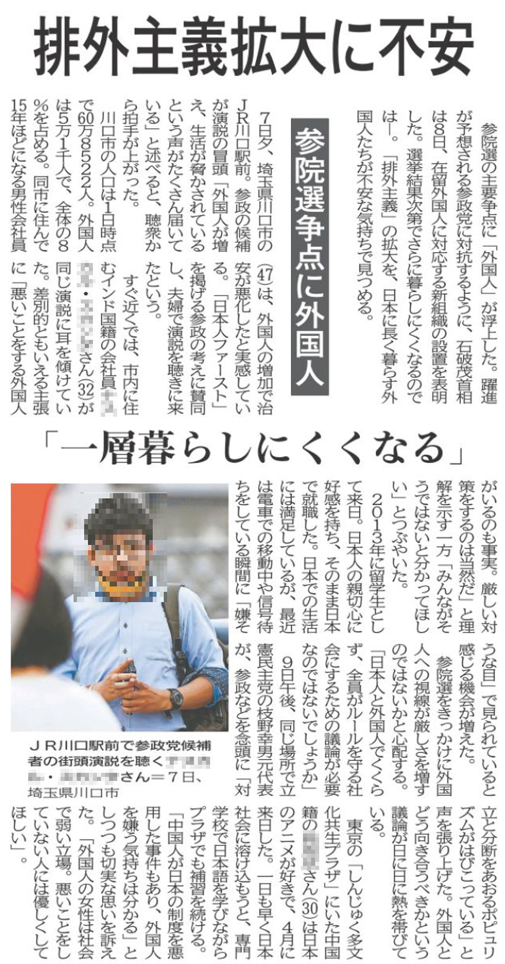 排外主義拡大に不安 参院選争点に外国人(徳島新聞 2025年7月10日付朝刊)