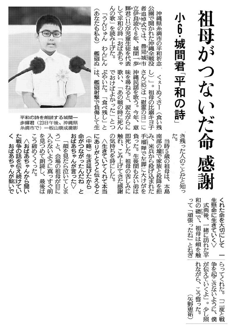 祖母がつないだ命 感謝 小6・城間君「平和の詩」(読売新聞 2025年6月24日付朝刊)