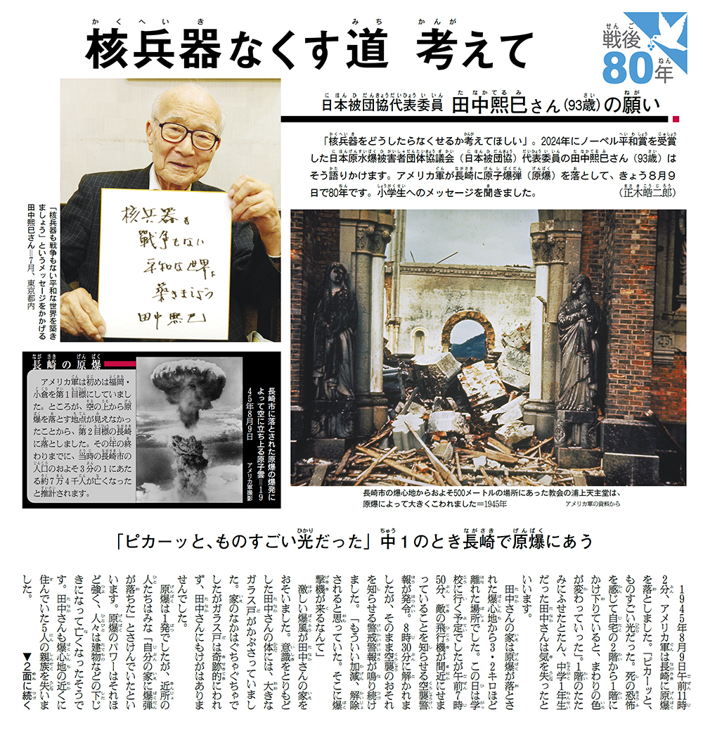 戦後80年 核兵器なくす道 考えて(朝日小学生新聞 2025年8月9日付)