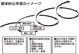 上記は小・中・高校の指導要領に記述されている総合的な学習の時間の目標の文面です。目標の明確化は、総合的な学習の時間の理念が共有されず補充学習などに充てられた事例もあった反省から、新たに「探求的な学習」の文言を加えて他教科との目標分担を図っています。教科全般で知識・技能の定着や活用する学習を行い、総合的な学習の時間には教科の枠を超えた横断的・総合的な学習、課題解決・探求的な学習の充実を求め目標外活用を戒めています。